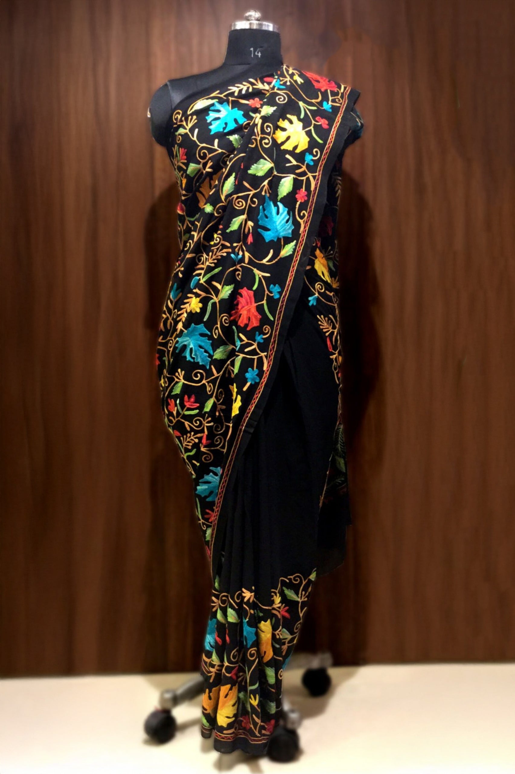 Slip into a saree that instantly makes you feel powerful, poised, and deeply connected to the artistic soul of Kashmir. The Zehra-e-Siyah drapes in fluid Viscose Georgette, its black canvas brought to life with vibrant, Aari embroidery — each motif a celebration of heritage and human touch. Lightweight, versatile, and timeless, it transitions effortlessly from festive evenings to intimate gatherings while honouring the artisans whose stories live through every stitch. Features include multi-colour Kashmiri Aari work, a breathable georgette body, and an Indian Crepe blouse fabric.
