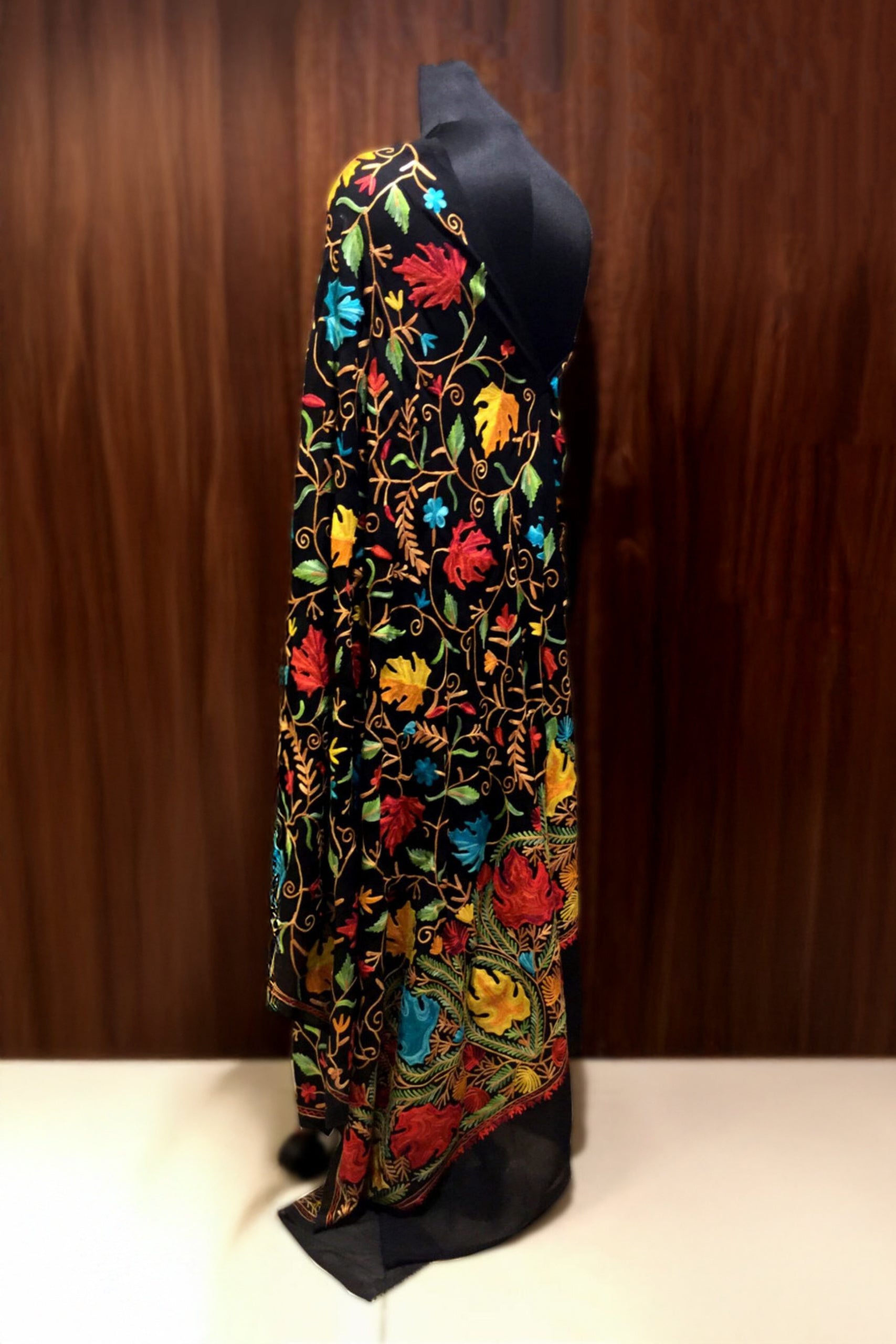 Pair with antique gold jhumkas or temple jewellery; the warm tones will harmonize beautifully with the colourful embroidery. A sleek bun or soft curls elevate the regal black backdrop.