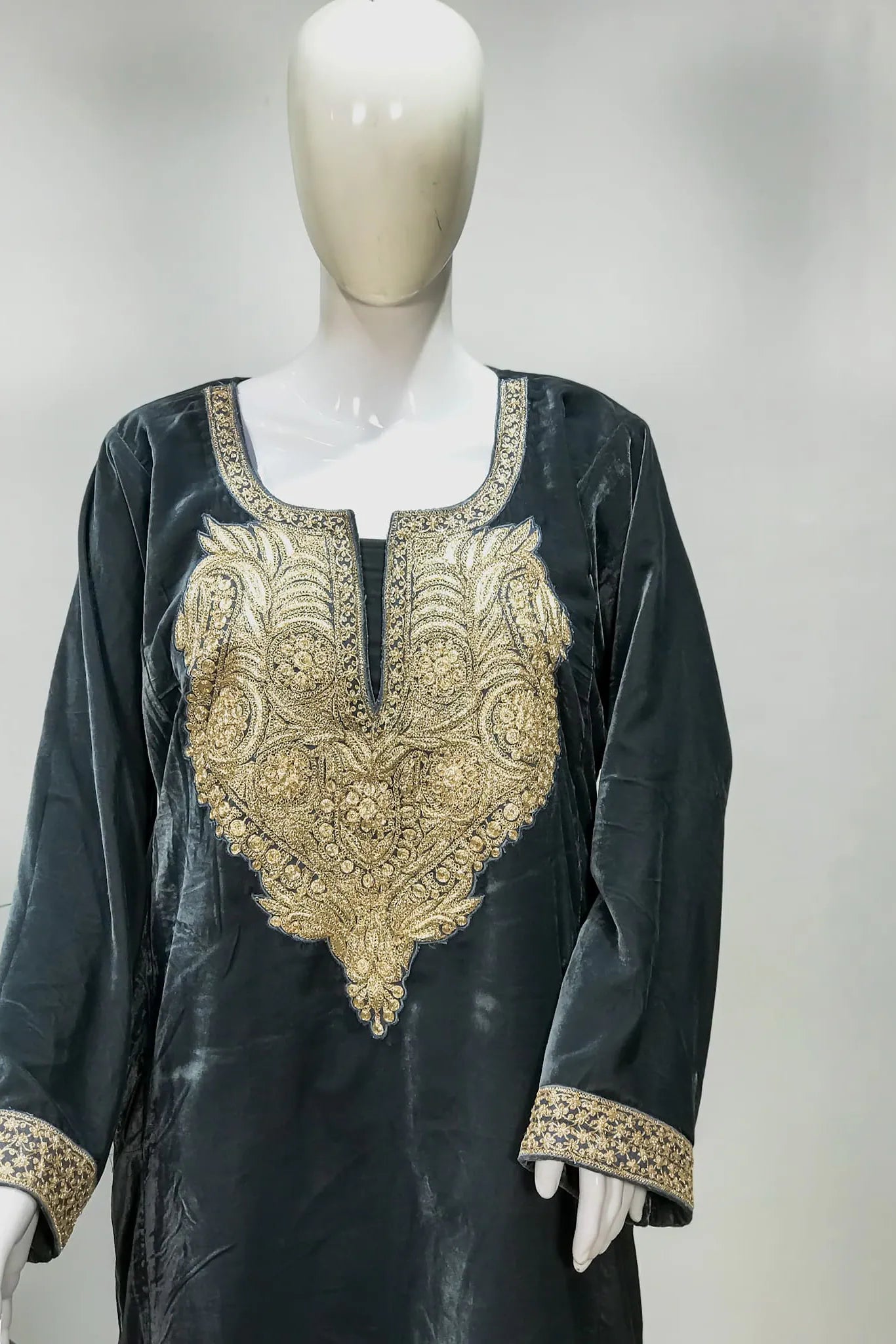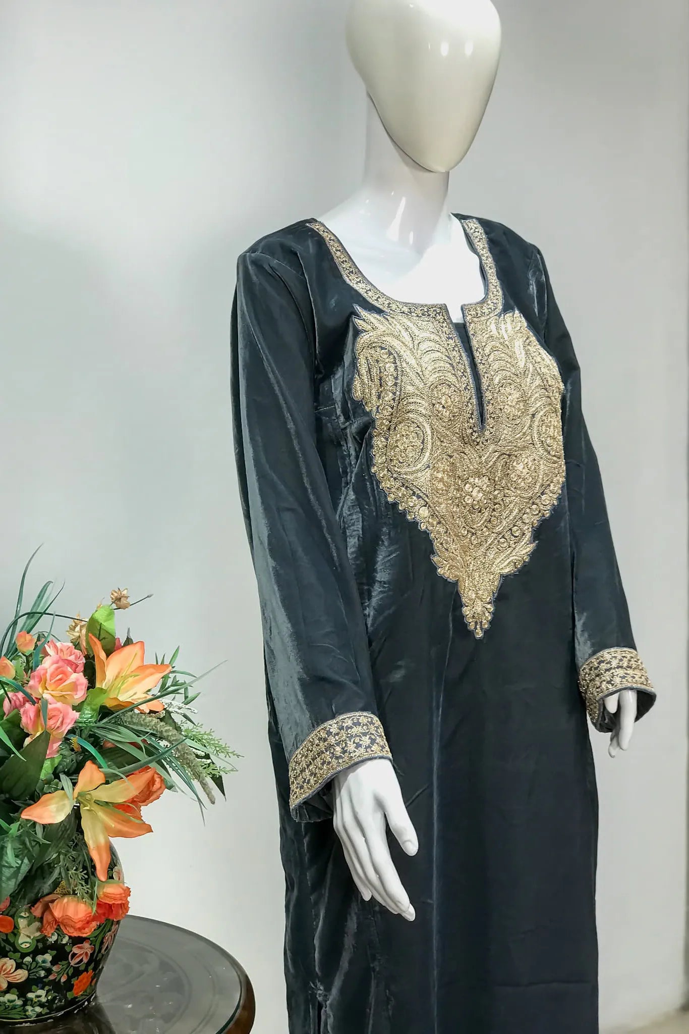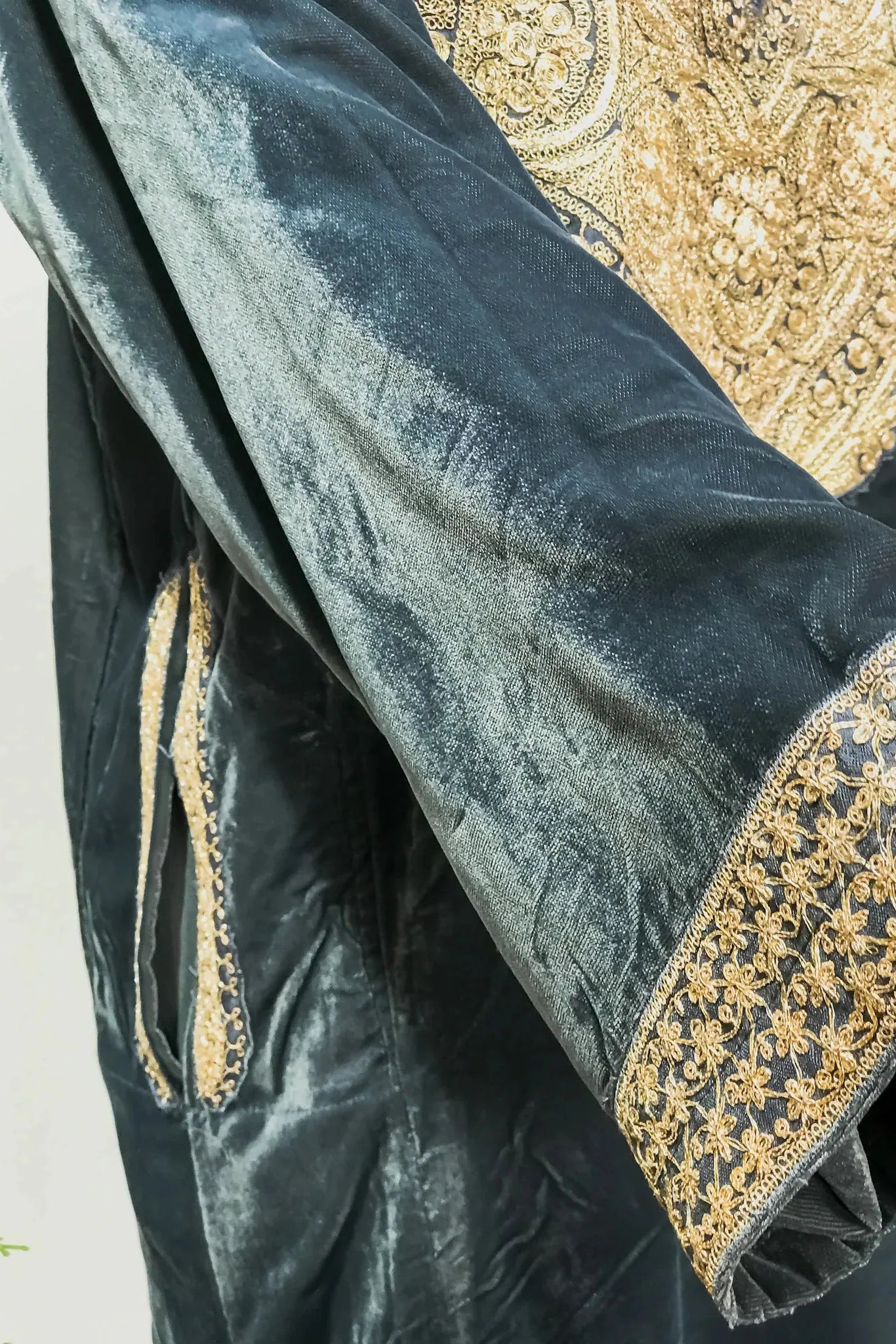 The first impression is quiet depth. The grey velvet holds light softly, neither dull nor bright, creating a calm surface for the gold embroidery to rest into. The neckline draws the eye inward, detailed and deliberate, as though the garment has been waiting patiently to be worn again.